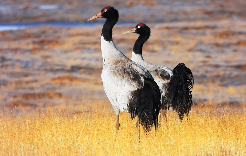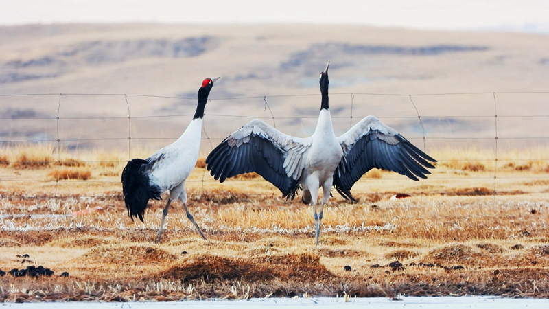 據悉,黑頸鶴在全球範圍內(nei) 僅(jin) 存1萬(wan) 餘(yu) 隻,是世界上最稀有、最珍貴的鶴類。黑頸鶴是中國青藏高原特有的高山珍禽,也是唯一生活在高原的鶴。每年初春時節,會(hui) 有近千隻黑頸鶴從(cong) 西藏林芝喜馬拉雅河穀越冬地遷徙到青海境內(nei) 的沼澤濕地、湖泊灘塗,並在高原短暫的夏季完成交配、築巢、孵卵、育幼的生活過程。1990年黑頸鶴被定為(wei) 青海省省鳥。