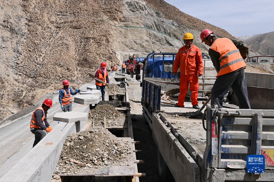 6月8日,在蓄集峽水利樞紐工程現場,施工人員進行大壩後預製塊鋪裝作業(ye) 。新華社記者 範培珅 攝