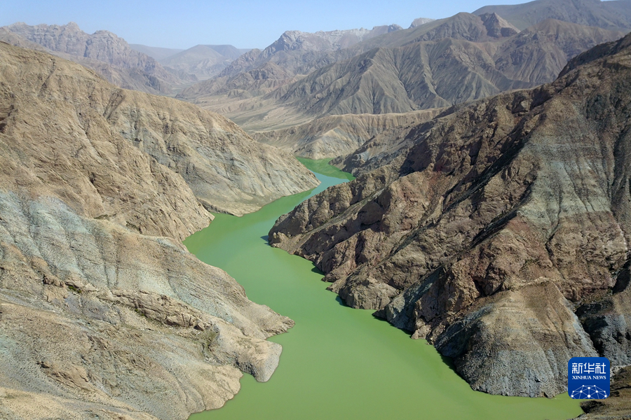 這是6月8日在青海省海西蒙古族藏族自治州德令哈市境內(nei) 拍攝的蓄水中的蓄集峽水庫(無人機照片)。新華社記者 範培珅 攝