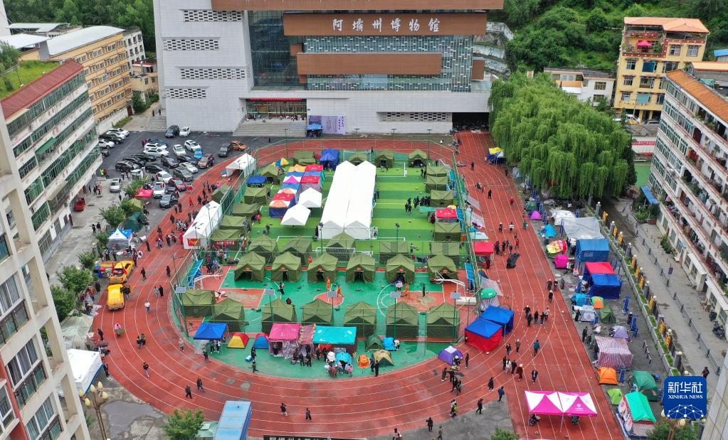 6月10日拍攝的馬爾康市州醫院背後廣場安置點(無人機照片)。新華社記者 劉坤 攝