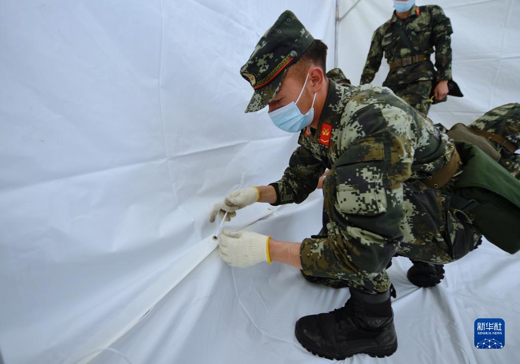6月10日,在馬爾康市州醫院背後廣場安置點內(nei) ,武警阿壩支隊隊員在搭建帳篷。新華社記者 劉坤 攝