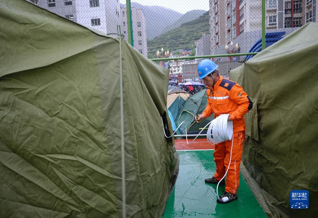 6月10日,在馬爾康市州醫院背後廣場安置點內(nei) ,國家電網工作人員在鋪設電線。新華社記者 劉坤 攝