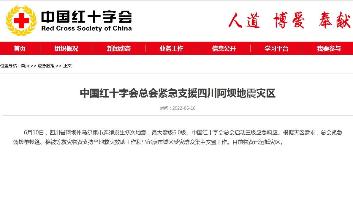 中國紅十字會總會緊急支援四川阿壩地震災區