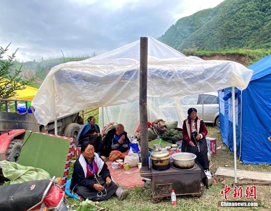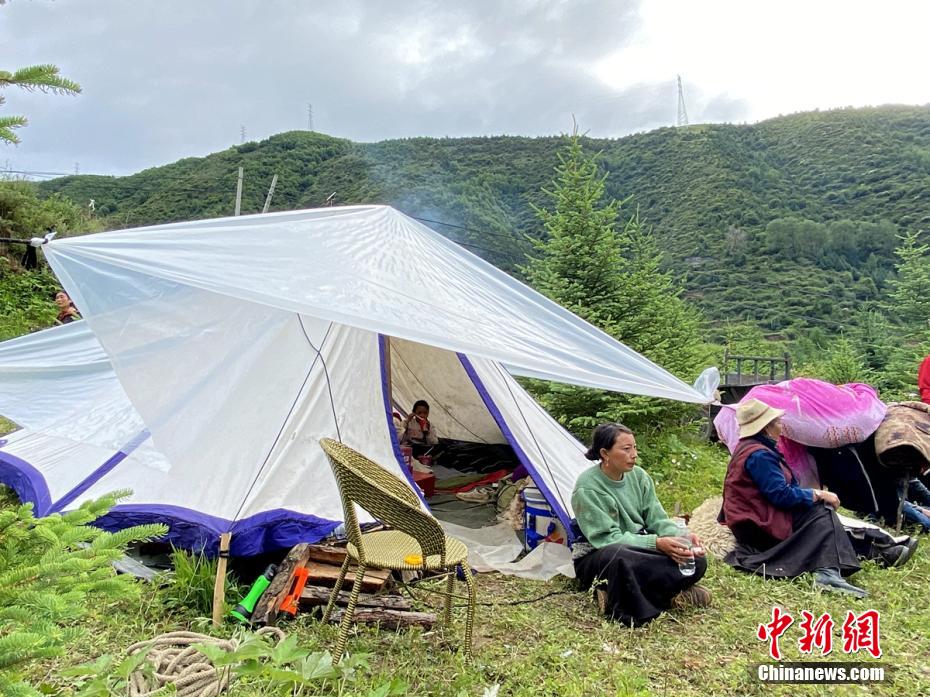 馬爾康市草登鄉(xiang) 呷秋受災村民坐在自己的帳篷前小憩。四川森林消防 供圖