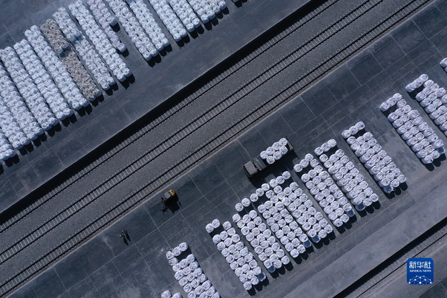 在青海鹽湖工業(ye) 股份有限公司鉀肥分公司貨場,車輛在裝運鉀肥(無人機照片)。(資料圖)新華社記者 張龍 攝