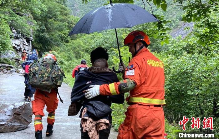 四川森林消防員撐起傘(san) 在雨中護送群眾(zhong) 轉移。四川森林消防供圖