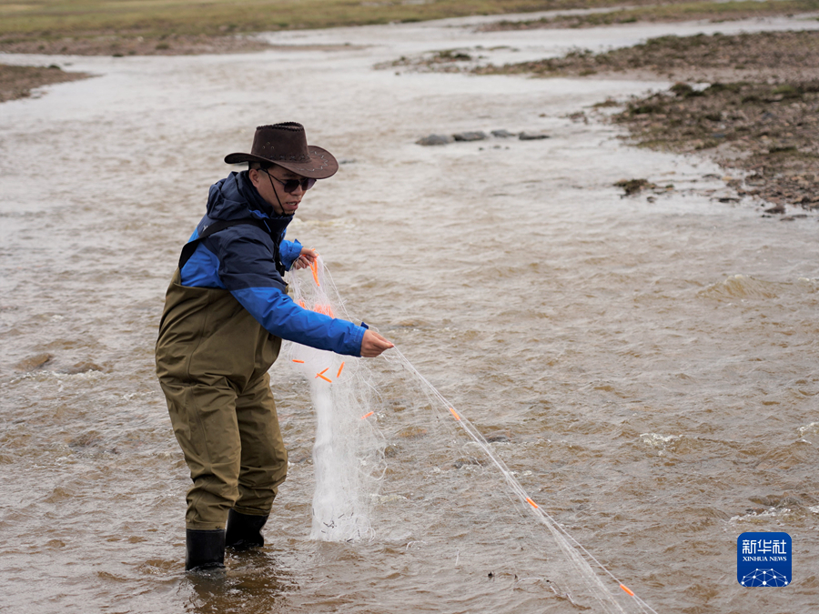 6月12日,李偉(wei) 在長江南源當曲河畔采集發育成熟的小頭裸裂尻魚。新華社記者 陳傑 攝