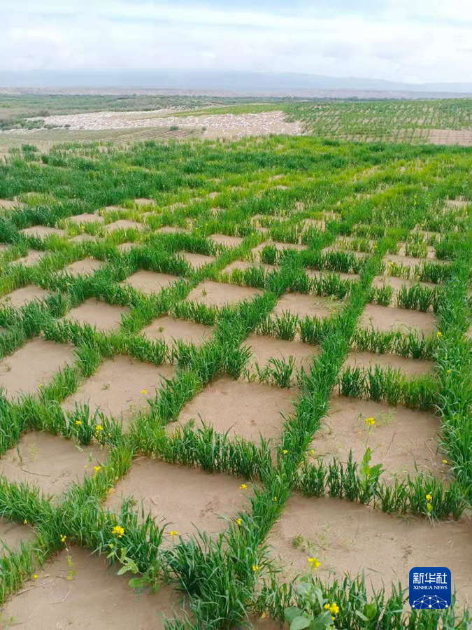 這是青海省治沙試驗站製作的草方格沙障。(受訪者供圖)