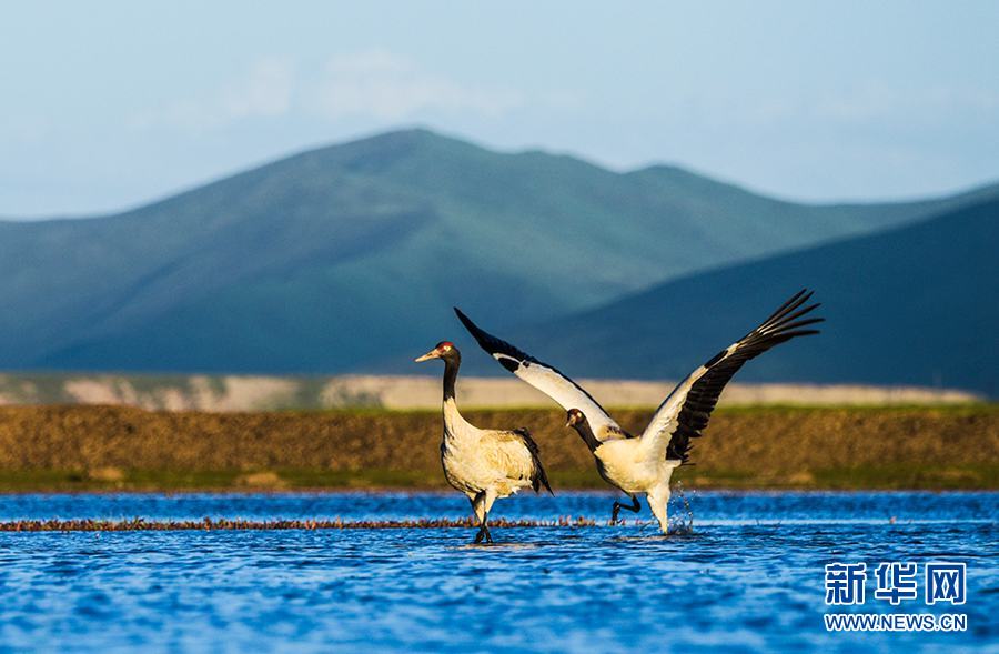 夕陽西下,大風肆虐。49歲的才項南加係上圍巾趕忙下車,從(cong) 後備箱包裹嚴(yan) 實的毛毯裏拿出相機和三腳架,稍做調試後,便扛著裝備三步並作兩(liang) 步地趕往200米外的一片濕地。“趕緊去看看,兩(liang) 隻黑頸鶴在喝水呢!”他說。