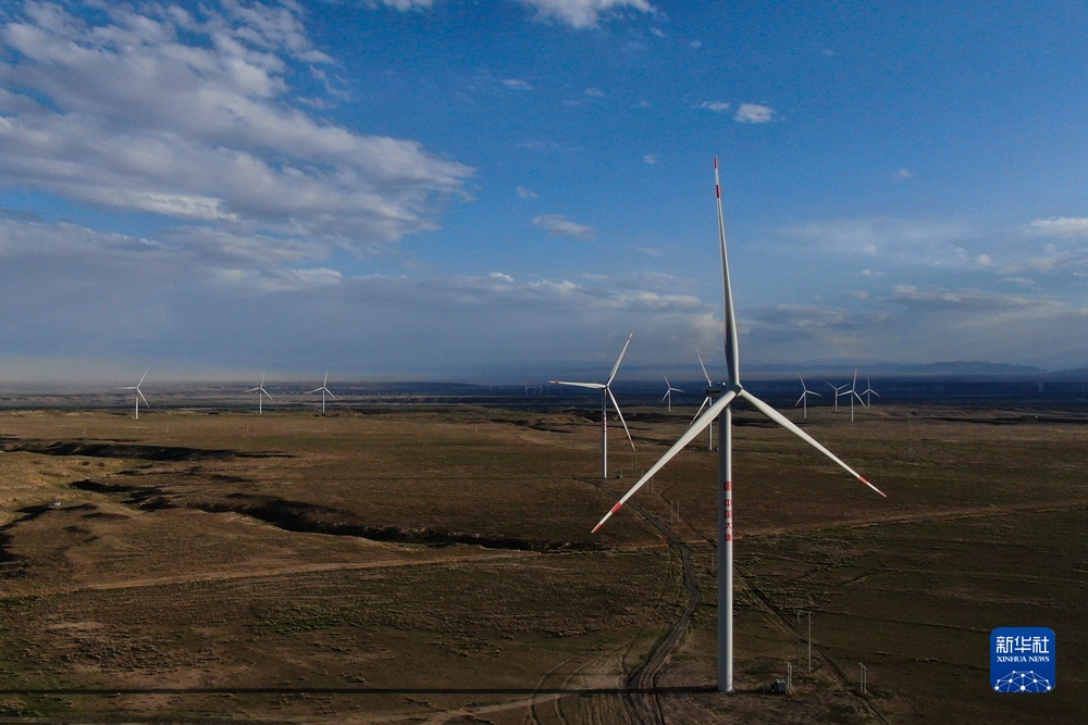 這是6月26日在青海省海南藏族自治州共和縣拍攝的風力發電機。新華社記者 張龍 攝
