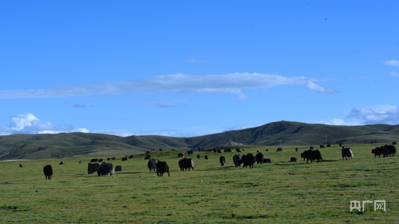 草原上悠閑覓食的犛牛。央廣網記者 樊永濤 攝