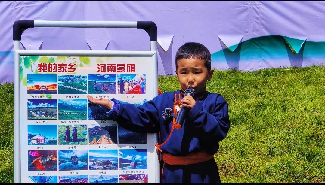 “我的家鄉(xiang) 在中國西部,這裏有一片非常美麗(li) 的大草原,大家都喜歡叫她‘河南蒙旗’,這裏有藍天、白雲(yun) 、草原、牛羊、湖泊、河流……”來自青海省黃南藏族自治州河南蒙古族自治縣中心幼兒(er) 園五歲半的觀卻東(dong) 珠作為(wei) “講解員”,正聲情並茂的向老師、同學以及家長介紹自己的家鄉(xiang) 。