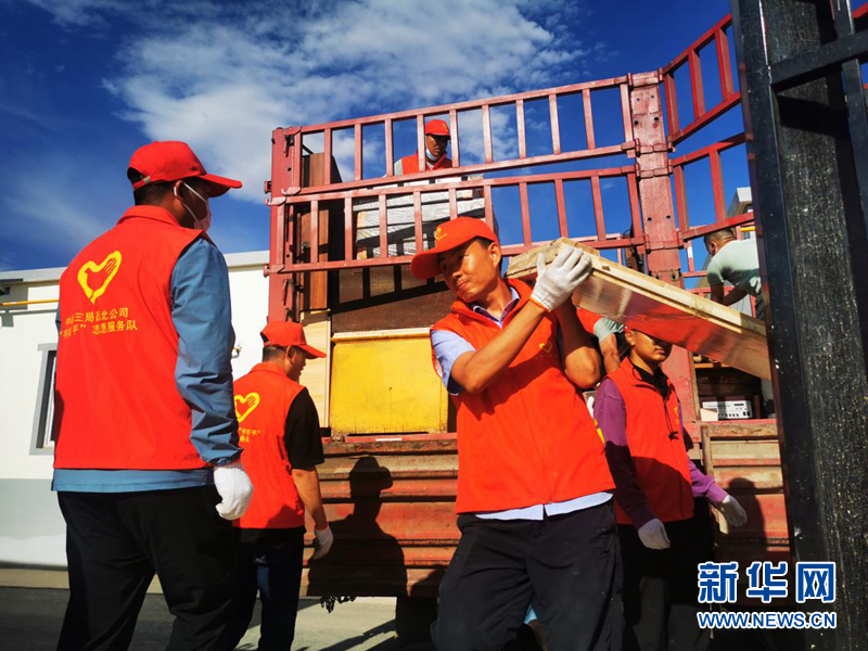 誌願服務隊為(wei) 搬遷群眾(zhong) 搬送物資。(圖片來源:中建三局西北公司)