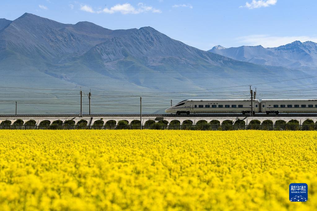 7月3日,列車駛過青海省海北藏族自治州門源回族自治縣境內(nei) 的油菜花田。新華社記者 張龍 攝
