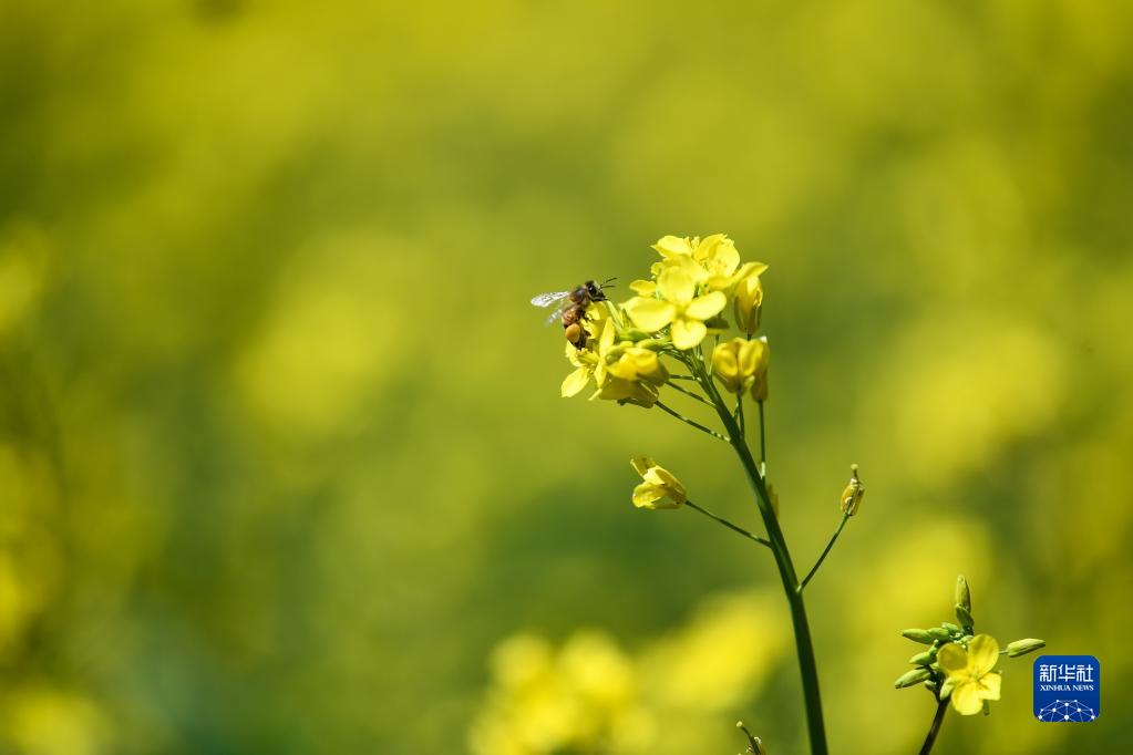 7月2日,在青海省海北藏族自治州門源回族自治縣境內(nei) 的油菜花田裏,一隻蜜蜂在采蜜。新華社記者 張龍 攝
