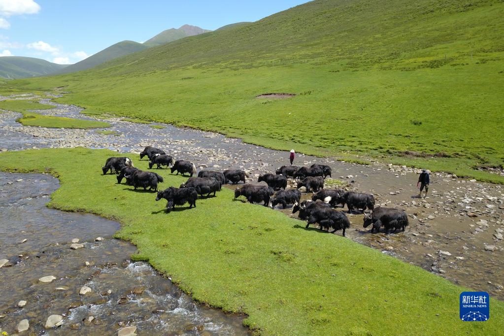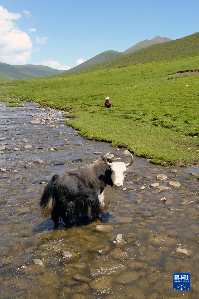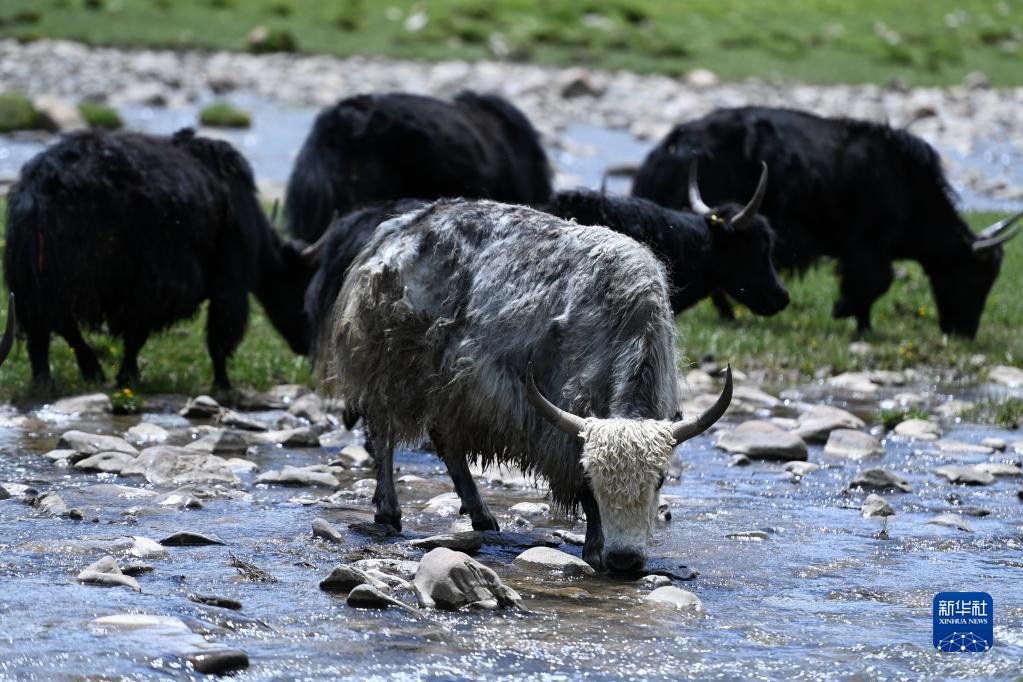在稱多縣歇武鎮牧業(ye) 村,犛牛在河中飲水(7月4日攝)。新華社記者 範培珅 攝