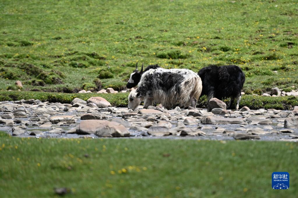 在稱多縣歇武鎮牧業(ye) 村,犛牛在河道中飲水(7月4日攝)。新華社記者 範培珅 攝