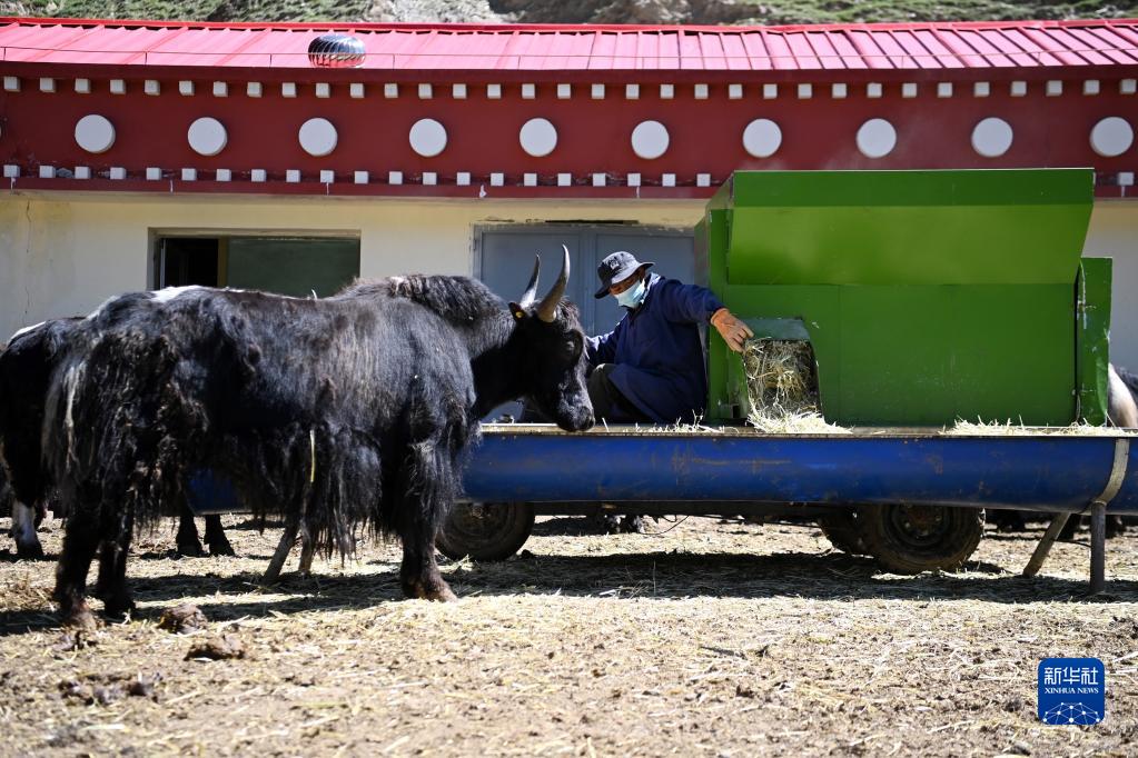 在稱多縣歇武鎮牧業(ye) 村的犛牛養(yang) 殖基地,工作人員駕駛自動撒料車給犛牛喂草(7月4日攝)。新華社記者 範培珅 攝