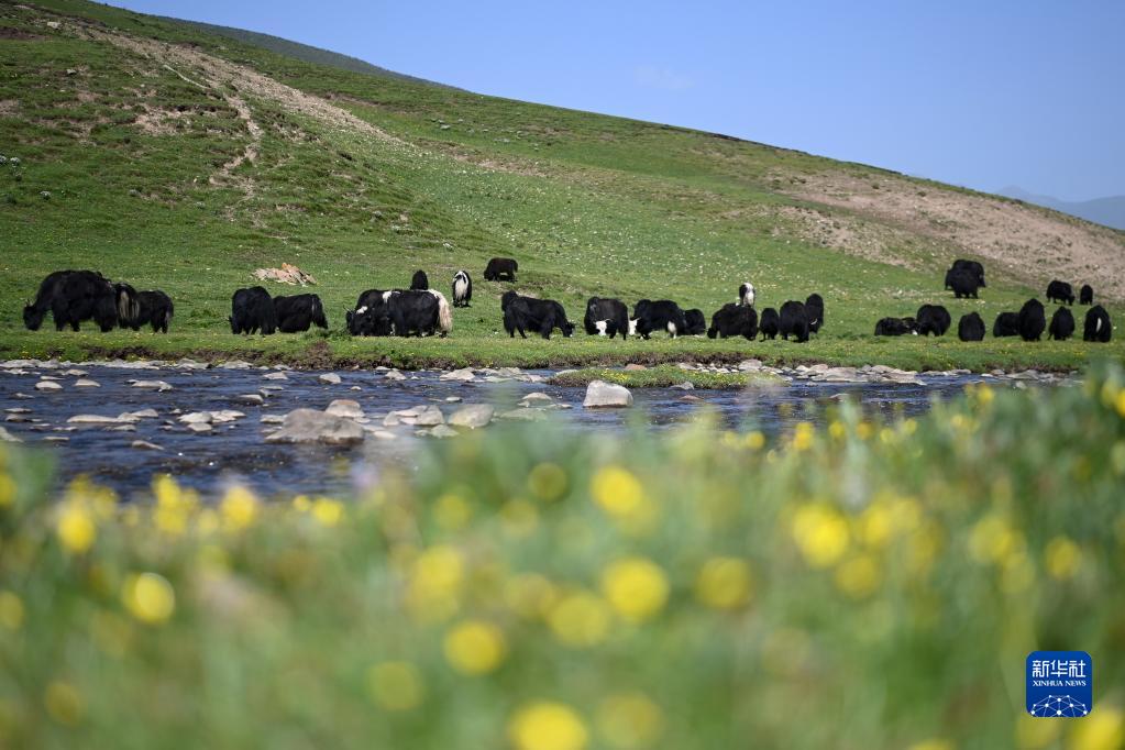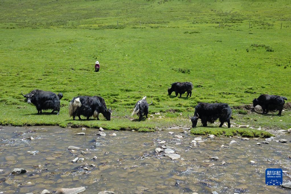 在稱多縣歇武鎮牧業(ye) 村,犛牛在河邊飲水(7月4日攝)。新華社記者 範培珅 攝