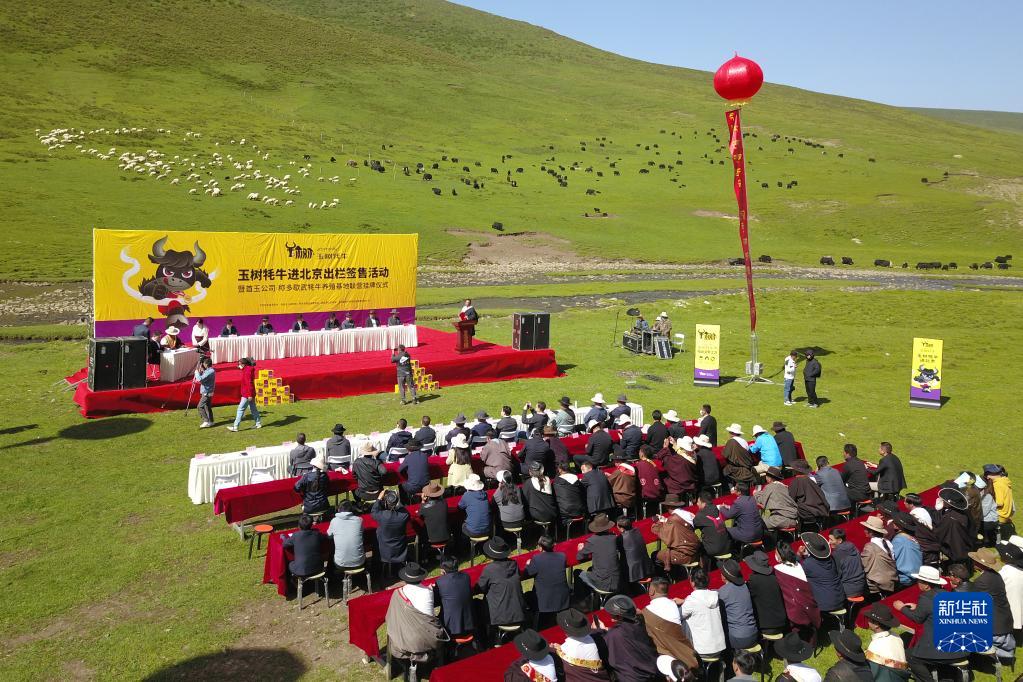 這是7月5日在稱多縣歇武鎮牧業(ye) 村拍攝的玉樹犛牛進北京出欄簽售活動現場(無人機照片)。新華社記者 範培珅 攝