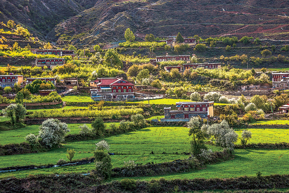 盛夏時節,在被稱作“藏民居藝術之都”的四川省甘孜藏族自治州道孚縣鮮水河畔,一幢幢整齊劃一、白牆棕柱的藏房,好似身著盛裝的藏族少女,點綴在天地間。