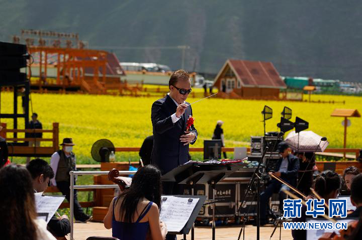 在海拔約3000米的油菜花海中,世界名曲、中國民歌依次奏起,花如海,樂(le) 如浪,音樂(le) 在山穀中回響。