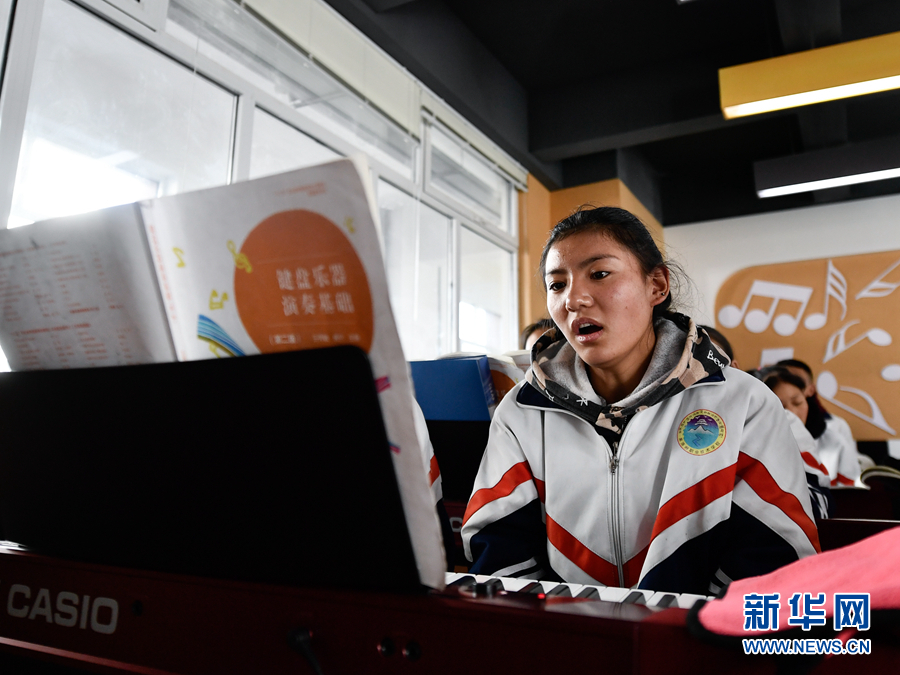 在果洛藏族自治州職業(ye) 技術學校,2020級學前教育專(zhuan) 業(ye) 學生楊央在上音樂(le) 課。(資料圖)新華社記者 張龍 攝