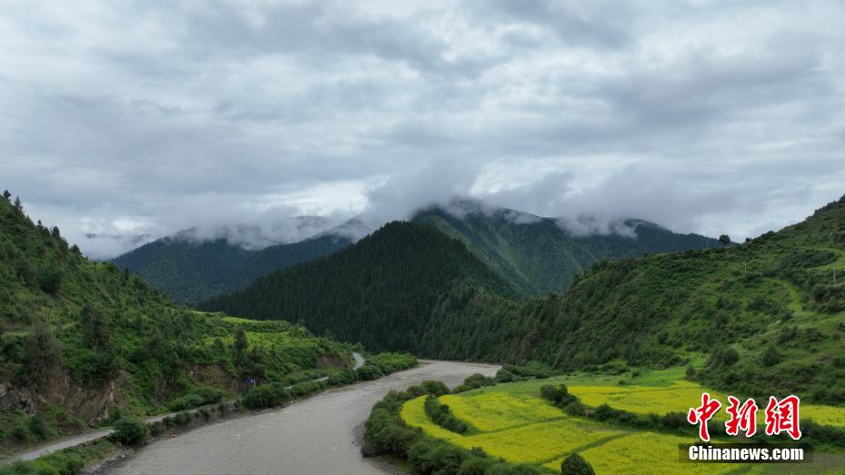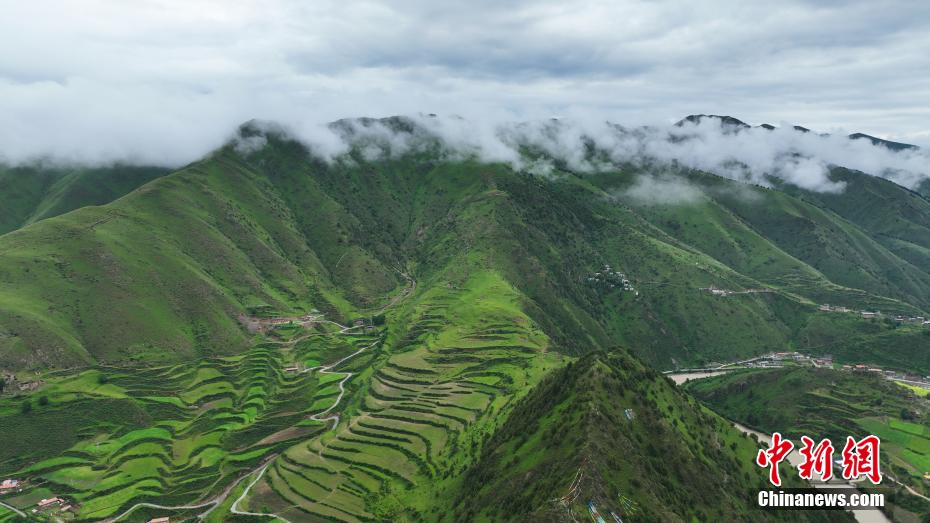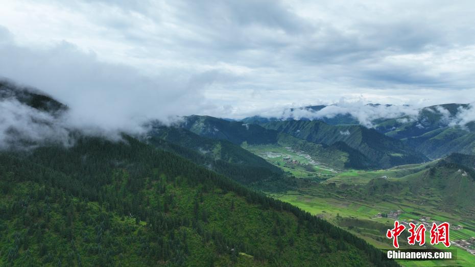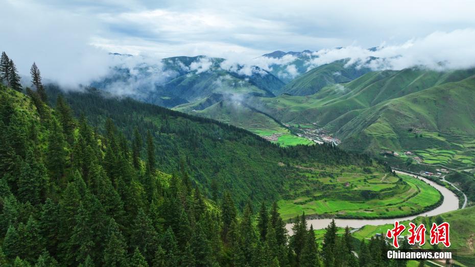 7月11日,一場降雨過後,雲(yun) 霧如潔白的哈達飄落在青海省果洛藏族自治州班瑪縣瑪可河國家森林公園山頭,與(yu) 樹木、河流、梯田相互映襯,自然風景美如畫。