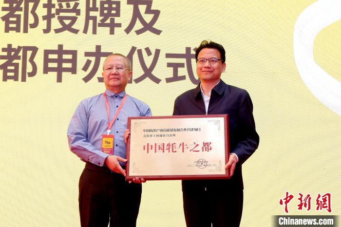 圖為(wei) 中國肉類協會(hui) 副會(hui) 長高觀(左)為(wei) 玉樹州授予“中國犛牛之都”稱號。李雋 攝