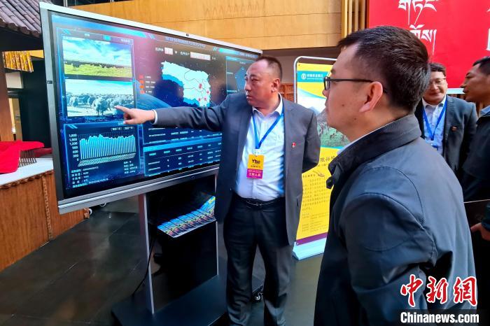 圖為(wei) 工作人員為(wei) 客商介紹玉樹犛牛智慧牧場係統。李雋 攝