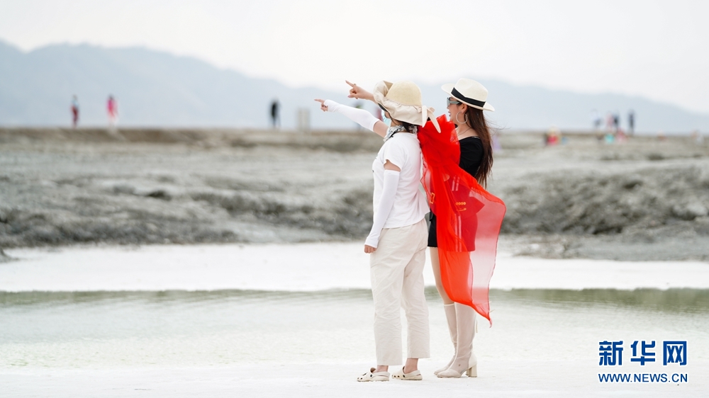 7月22日,遊客在海西州茫崖市境內(nei) 的翡翠湖遊玩。