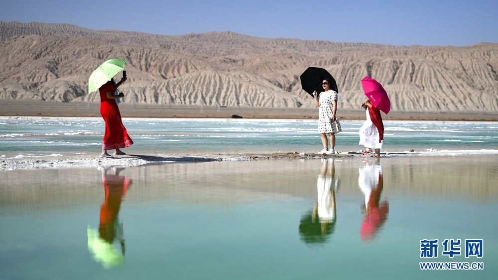 7月20日,遊客在海西州大柴旦行委境內(nei) 的翡翠湖遊玩。
