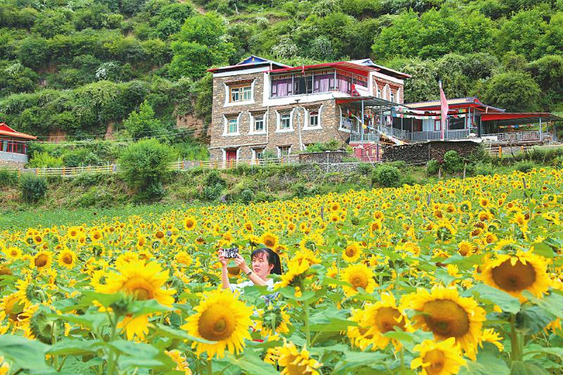 7月24日,從(cong) 四川省阿壩藏族羌族自治州馬爾康市區出發,行駛20多公裏便抵達鬆崗鎮洛威村。一下車,成片的向日葵花海撲入眼簾,錯落有致的藏式民居點綴其間。
