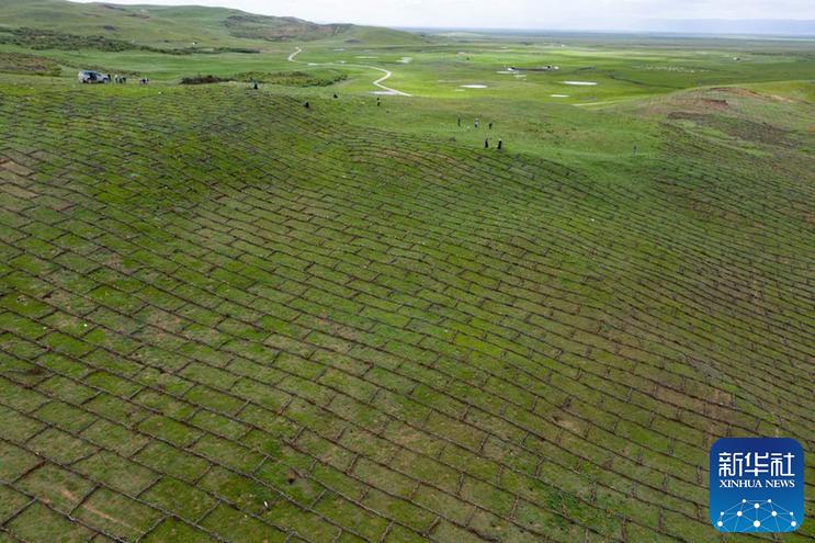 7月25日,在若爾蓋縣麥溪鄉(xiang) 黑河村,村民用高原柳編成沙障(無人機拍攝)。新華社記者 江宏景 攝