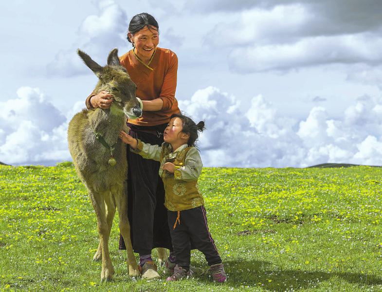 達瓦拉姆帶著三歲的孩子白馬仁真和小鹿一起散步。尹鋼 攝