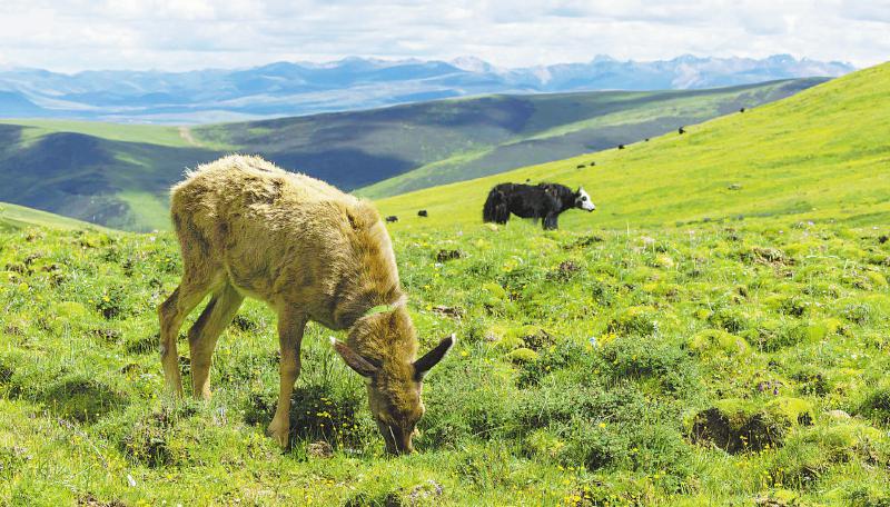 小白唇鹿每天都會(hui) 跟著達瓦拉姆家的犛牛群在高原牧場吃草玩耍。尹鋼 攝
