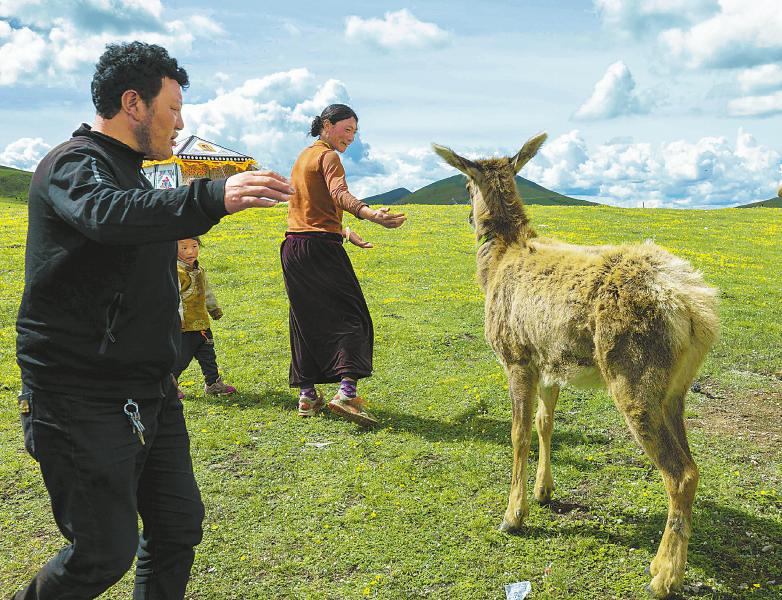 小白唇鹿每天都會(hui) 回到牧民定居點的達瓦拉姆家門口。尹鋼 攝
