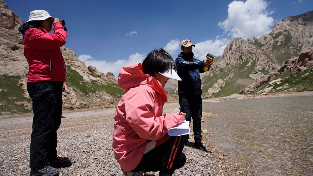 7月27日,來自青海省水文水資源測報中心的江源科考隊員在測量河流流速和記錄數據。新華社 陳傑 攝