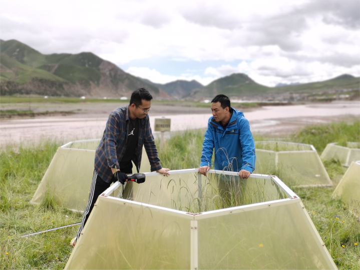 “模擬增溫試驗”是國際上觀測不同增溫狀態下植物生態係統變化的主要研究方式。這項實驗通過在草地上安裝不同高度的溫箱,布設傳(chuan) 感器觀測箱內(nei) 溫度,模擬形成不同增溫條件,從(cong) 而分析以高原嵩草為(wei) 優(you) 勢種的高寒草甸植被對氣候變暖的響應。
