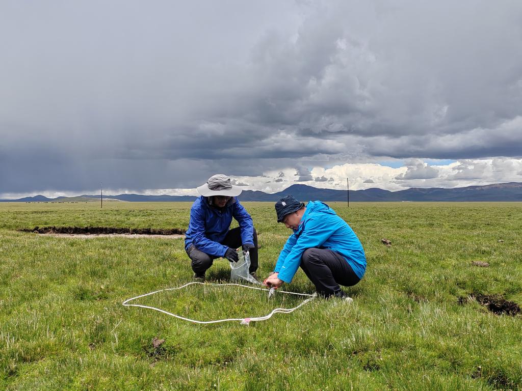 7月17日,科考隊員任斐鵬(右)和孫寶洋在觀測自然狀態下高寒草甸生態係統狀況。(受訪者供圖)