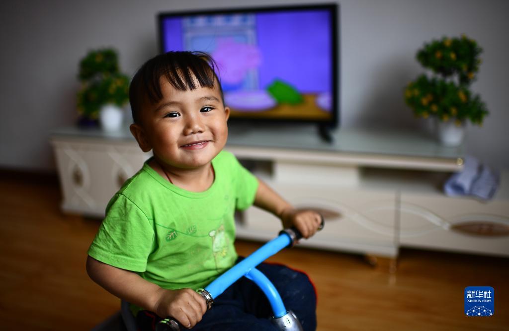 在青海省黃南藏族自治州河南蒙古族自治縣易地扶貧搬遷安置小區幸福家園,智後茂村牧民旦卻卓瑪的兒(er) 子羅藏智華在家中玩耍(2018年6月13日攝)。新華社記者 張宏祥 攝