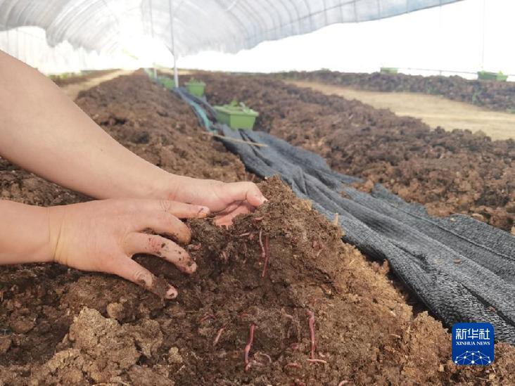 阿壩州遠龍養(yang) 殖有限公司在大棚裏用牛糞養(yang) 蚯蚓。新華社記者 李倩薇 攝