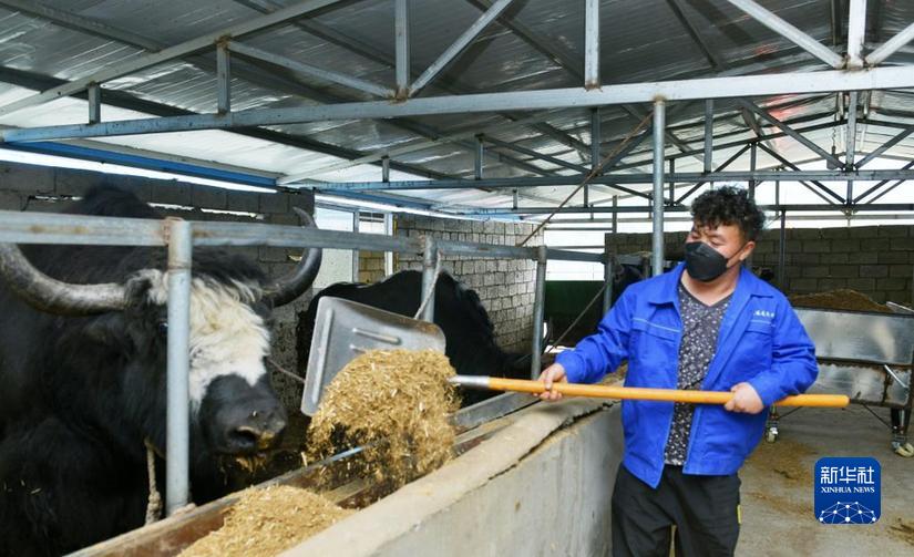 山高雲(yun) 低,在四川省阿壩藏族羌族自治州小金縣美興(xing) 鎮下馬廠村麻足寨的山頂,村民唐裕龍正給養(yang) 殖場的犛牛喂飼草、鏟牛糞。