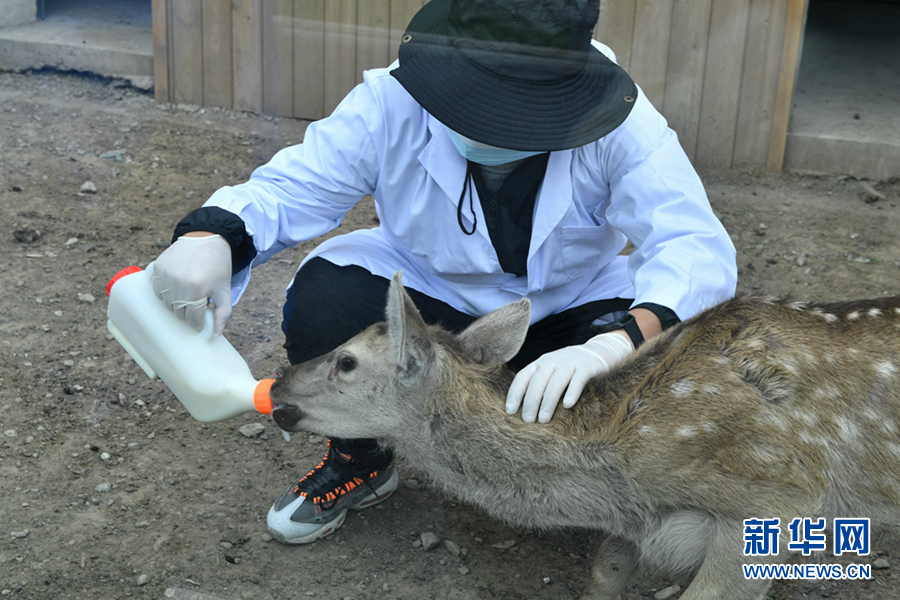 在祁連山國家公園青海片區野生動物救護繁育中心內(nei) ,工作人員正在給馬鹿喂奶。新華網 卡婭梅朵 攝