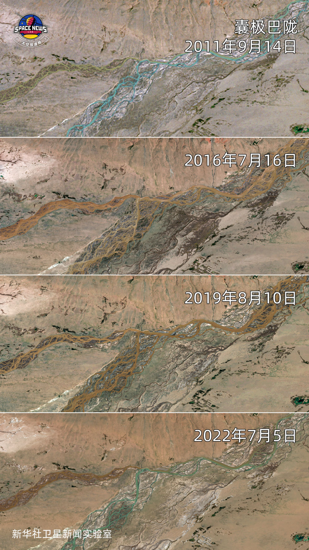 在長江正源沱沱河和南源當曲匯合的囊極巴隴,不同時期的衛星圖像清晰顯示,江源水係河道衝(chong) 淤頻繁,水流不斷分汊又匯集,鳥瞰就像在大地上紮起許多小辮子。
