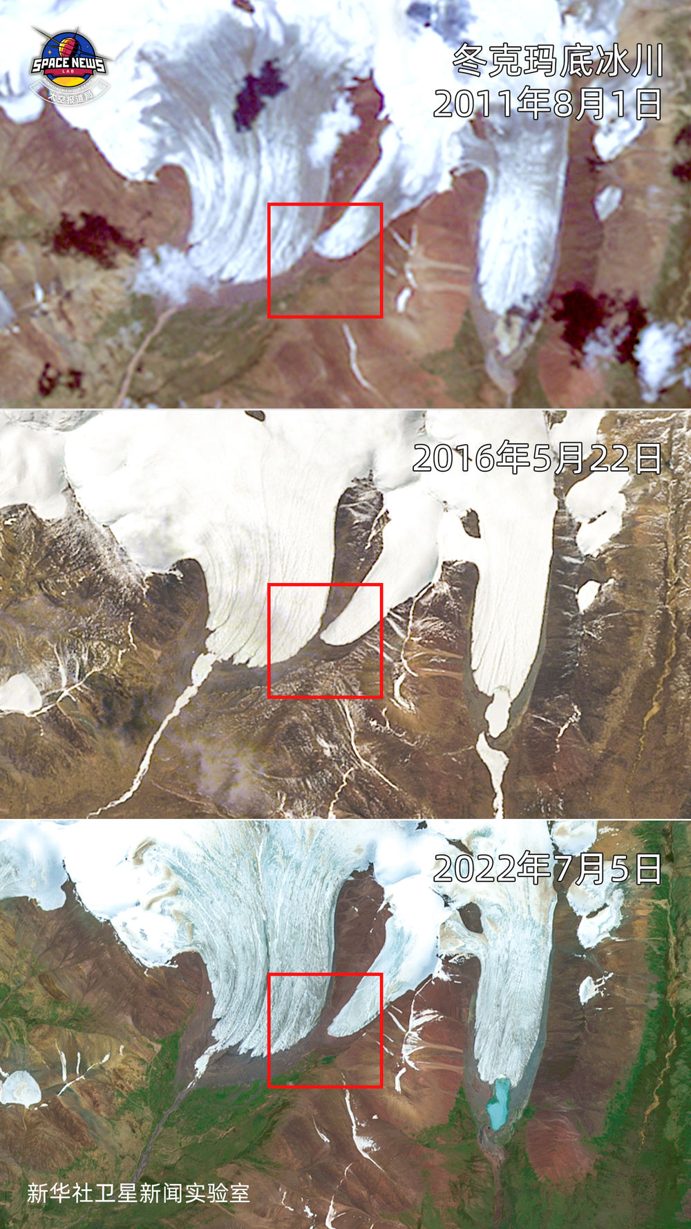 從(cong) 冬克瑪底冰川不同年份衛星遙感圖像可以看出,在2011年冬克瑪底冰川還是一個(ge) 整體(ti) ,此後就陸續分為(wei) 大、小冬克瑪底兩(liang) 條冰川。紅框區域內(nei) 變化,說明兩(liang) 條冰川末端之間距離逐漸拉大,處於(yu) 消融退縮。