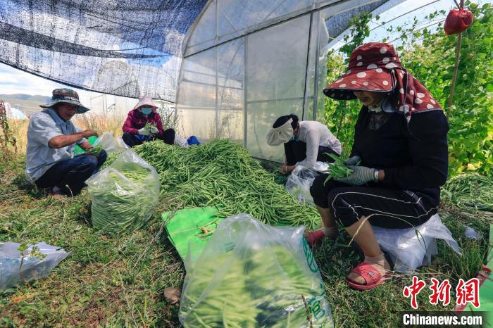 八月中旬,在四川省阿壩藏族羌族自治州壤塘縣的熱布卡蔬菜基地,五月種植的第一批四季豆(學名菜豆,下同)正值豐(feng) 收。50歲的陳老會(hui) 年初從(cong) 雲(yun) 南來到四川壤塘工作,她和工友們(men) 將剛采摘的四季豆篩選裝袋,近五十斤重的包裝袋整齊鋪滿地麵。“我們(men) 下午采摘的蔬菜,第二天早上就能出現在成都的市場上。”她頭也不抬地忙著手中的活。
