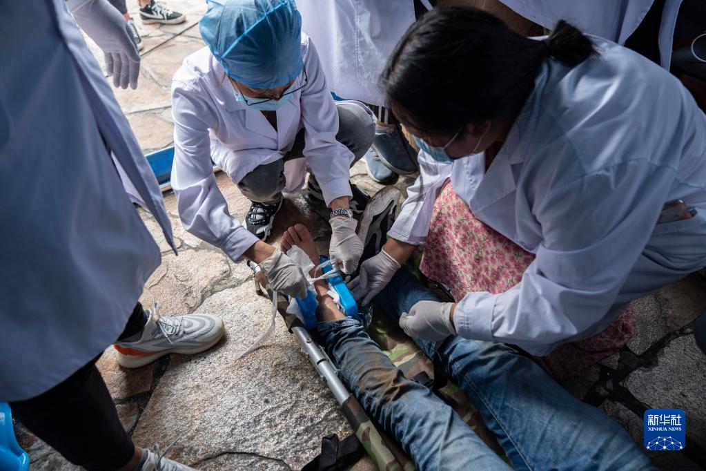 9月6日,在四川甘孜州瀘定縣磨西鎮海螺溝廣場受災群眾(zhong) 臨(lin) 時安置點,醫護人員為(wei) 傷(shang) 員包紮。新華社記者 才揚 攝