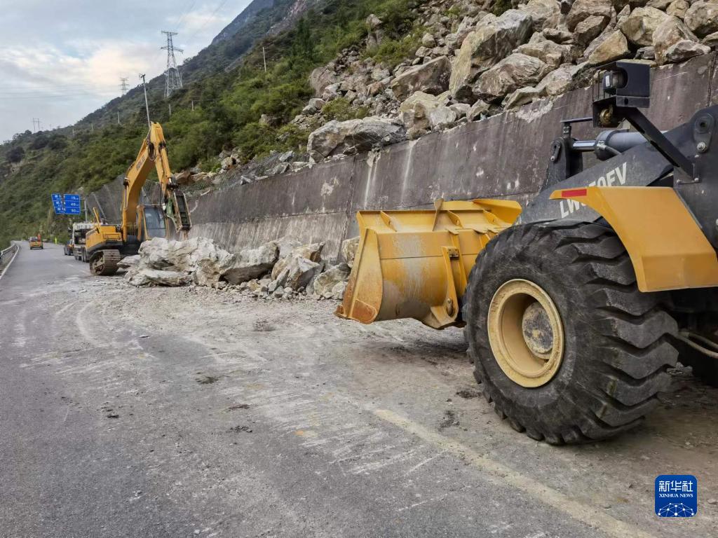 9月6日上午,工程機械在省道S217線瀘石路快速通道K30二裏壩段進行搶通作業(ye) 。新華社發