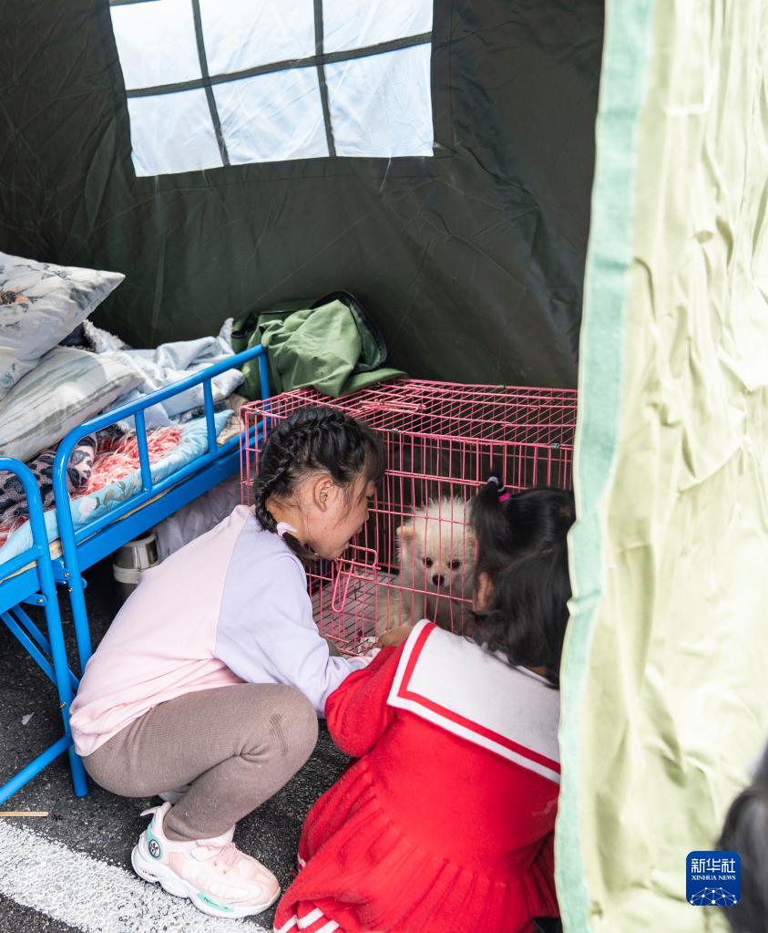9月6日,在四川甘孜州瀘定縣磨西鎮海螺溝廣場受災群眾(zhong) 臨(lin) 時安置點,兒(er) 童與(yu) 從(cong) 家中帶過來的小狗玩耍。新華社記者 才揚 攝